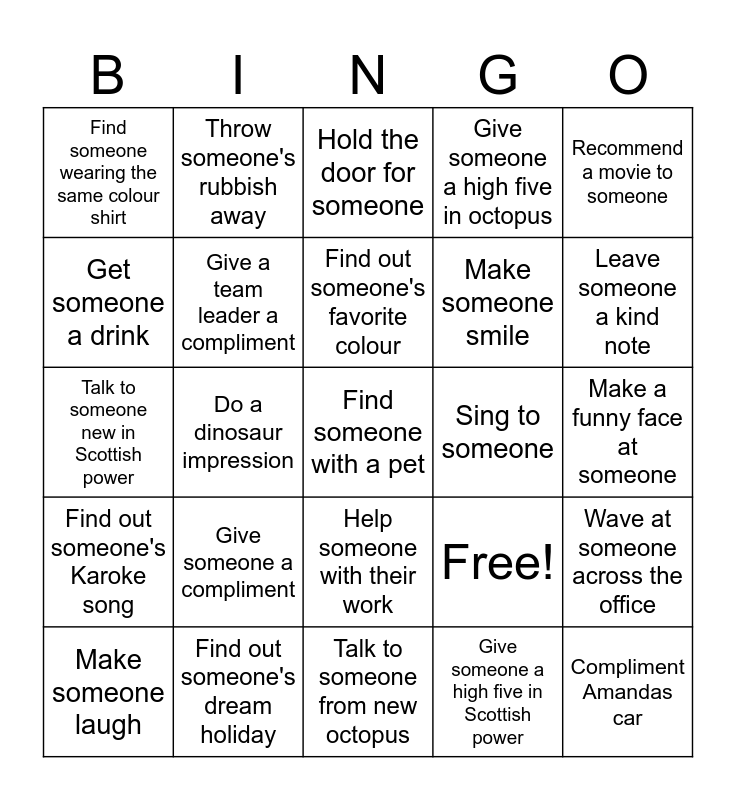 This bingo card has 25 words: Give someone a compliment, Talk to someone from new octopus, Find out someone's favorite colour, Make someone laugh, Recommend a movie to someone, Find someone wearing the same colour shirt, Get someone a drink, Throw someone's rubbish away, Sing to someone, Help someone with their work, Make someone smile, Talk to someone new in Scottish power, Free!, Wave at someone across the office, Give a team leader a compliment, Compliment Amandas car, Make a funny face at someone, Hold the door for someone, Leave someone a kind note, Do a dinosaur impression, Find someone with a pet, Find out someone's dream holiday, Find out someone's Karoke song, Give someone a high five in octopus and Give someone a high five in Scottish power.