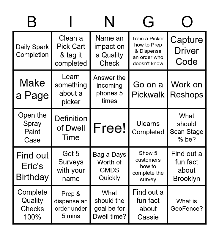 This bingo card has a free space and 24 words: Get 5 Surveys with your name, Prep & dispense an order under 5 mins, Answer the incoming phones 5 times, Complete Quality Checks 100%, Capture Driver Code, Daily Spark Completion, Make a Page, Clean a Pick Cart & tag it completed, Ulearns Completed, Bag a Days Worth of GMDS Quickly, Go on a Pickwalk, Open the Spray Paint Case, Show 5 customers how to complete the survey, Find out a fun fact about Brooklyn, Learn something about a picker, Find out a fun fact about Cassie, What should Scan Stage % be?, Name an impact on a Quality Check, Work on Reshops, Definition of Dwell Time, What is GeoFence?, Find out Eric's Birthday, Train a Picker how to Prep & Dispense an order who doesn't know and What should the goal be for Dwell time?.