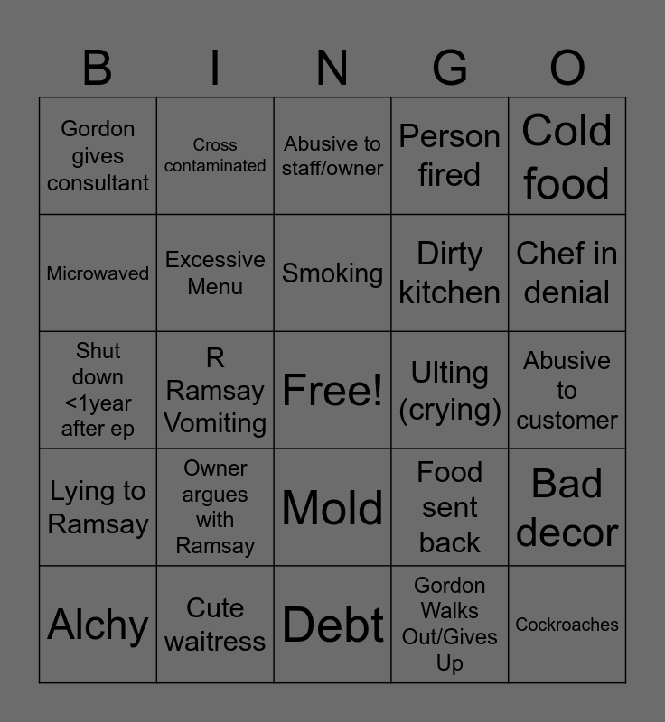 This bingo card has a free space and 24 words: Owner argues with Ramsay, Cute waitress, Smoking, Alchy, Cold food, Gordon gives consultant, Microwaved, Cross contaminated, Ulting (crying), Mold, Dirty kitchen, Shut down <1year after ep, Food sent back, Bad decor, Excessive Menu, Gordon Walks Out/Gives Up, Abusive to customer, Abusive to staff/owner, Chef in denial, R Ramsay Vomiting, Cockroaches, Lying to Ramsay, Person fired and Debt.