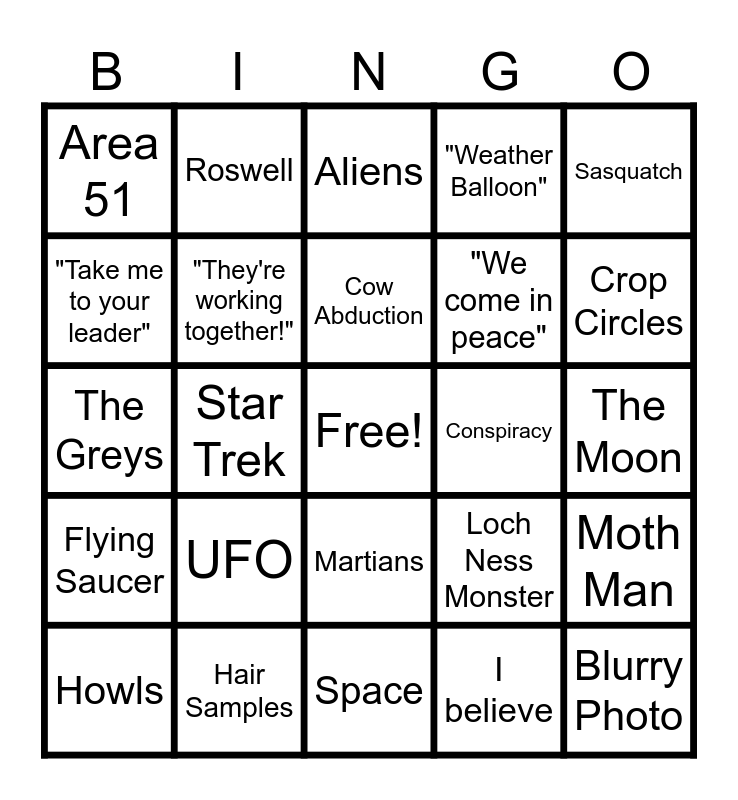 This bingo card has a free space and 44 words: Bigfoot, Blurry Photo, Footprints, Howls, Zeta, I believe, Aliens, Yeti, Sasquatch, Hair Samples, "Weather Balloon", Conspiracy, Martians, UFO, Tree Knocks, Space, Galactic, The Greys, Skunk Ape, Crop Circles, Roswell, We Come in Peace, Spaceship, Area 51, Venus, The Moon, The Chupacabra, Men in Black, Loch Ness Monster, Flying Saucer, Space Bigfoot, Moth Man, Cryptid, The Yowie, Star Trek, Star Wars, Bigfoot Vlogs, Gone Squatchin', Cow Abduction, "Take me to your leader", "We come in peace", Little Green Alien, "They're working together!" and Patterson Gimlin.