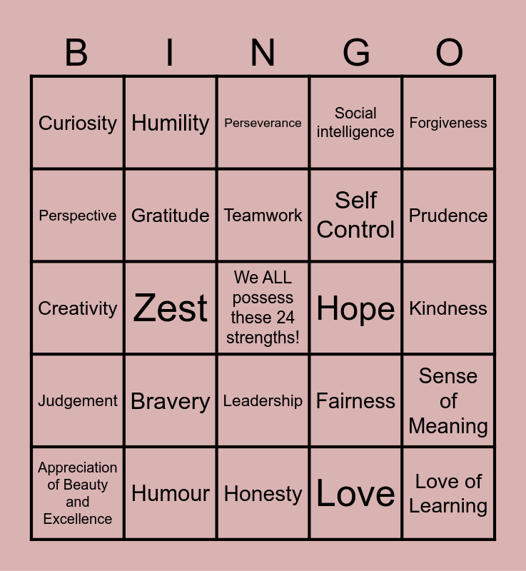 This bingo card has a free space and 24 words: Appreciation of Beauty and Excellence, Bravery, Teamwork, Love, Forgiveness, Curiosity, Humility, Perseverance, Hope, Kindness, Creativity, Gratitude, Fairness, Sense of Meaning, Perspective, Humour, Honesty, Social intelligence, Prudence, Judgement, Zest, Leadership, Self Control and Love of Learning.