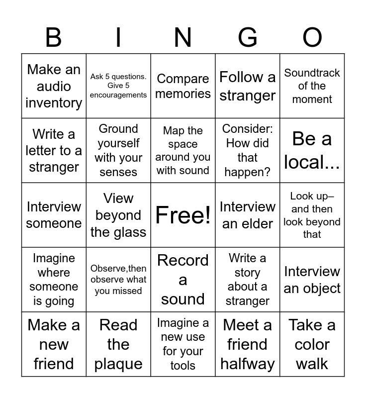 This bingo card has a free space and 28 words: Interview an object, Read the label, Consider: How did that happen?, Meet a friend halfway, Write a letter to a stranger, Compare memories, Ask 5 questions. Give 5 encouragements, Imagine where someone is going, Interview an elder, Make a new friend, Interview someone, Follow a stranger, Read the plaque, Imagine a new use for your tools, Be a local..., Take a photo walk, without your camera, Observe,then observe what you missed, Ground yourself with your senses, Map the space around you with sound, Record a sound, Make an audio inventory, Sketch a room you just left, Take a color walk, View beyond the glass, Look up–and then look beyond that, Write a story about a stranger, Soundtrack of the moment and Create a sticker of something you notice.