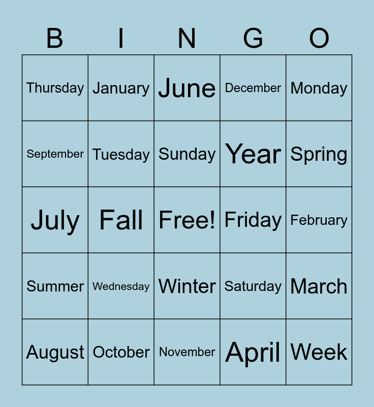 This bingo card has a free space and 24 words: August, Wednesday, Sunday, April, Monday, Thursday, January, June, Friday, February, July, Tuesday, Saturday, March, September, October, November, December, Spring, Summer, Fall, Winter, Year and Week.