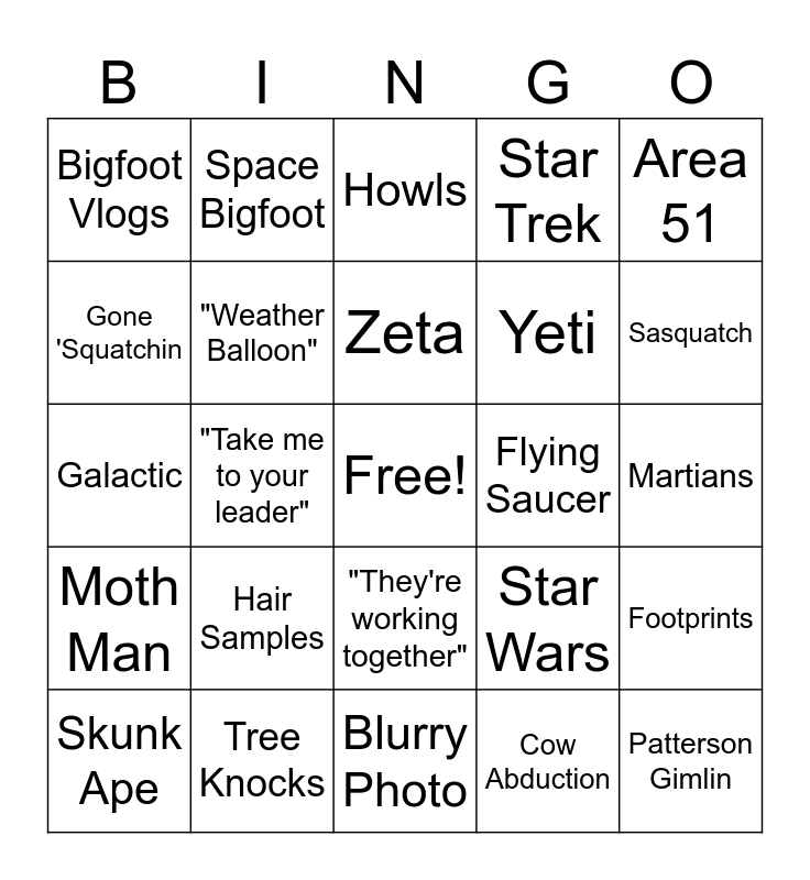 This bingo card has a free space and 45 words: The Yowie, Patterson Gimlin, "We Come in Peace", Skunk Ape, Cryptid, Cow Abduction, Howls, Loch Ness Monster, Area 51, Tree Knocks, Star Trek, Flying Saucer, "They're working together", Hair Samples, Spaceship, Blurry Photo, Venus, Galactic, Roswell, Sasquatch, Space Bigfoot, UFO, "I Believe", Bigfoot Vlogs, The Chupacabra, Martians, Space, "We Come in Peace", Star Wars, Moth Man, Conspiracy, Footprints, Bigfoot, The Greys, Little Green Alien, "Take me to your leader", Aliens, Crop Circles, Men in Black, Zeta, Gone 'Squatchin, Yeti, "Weather Balloon", "Weather Balloon" and The Moon.