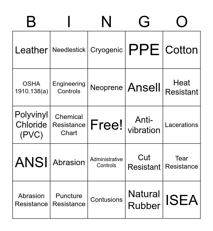 This bingo card has a free space and 35 words: Hierarchy of Controls, Elimination, Substitution, Engineering Controls, Administrative Controls, PPE, OSHA 1910.138(a), Nitrile, Neoprene, Kevlar, Polyvinyl Chloride (PVC), Cotton, Wire Mesh, Welding, Leather, Anti-vibration, Natural Rubber, Chemical Resistance Chart, ANSI, ISEA, Cut Resistant, Abrasion Resistance, Tear Resistance, Puncture Resistance, Cryogenic, Heat Resistant, ASTM, Honeywell, Ansell, Lacerations, Punctures, Contusions, Abrasion, Needlestick and Animal Bites.