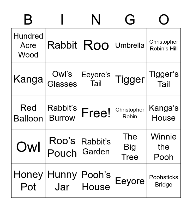 This bingo card has a free space and 28 words: Winnie the Pooh, Piglet, Tigger, Eeyore, Kanga, Roo, Rabbit, Owl, Christopher Robin, Honey Pot, Red Balloon, Umbrella, Hunny Jar, Pooh’s House, Tigger’s Tail, Piglet’s Scarf, Roo’s Pouch, Owl’s Glasses, Eeyore’s Tail, Rabbit’s Garden, Hundred Acre Wood, Gloomy Place, Poohsticks Bridge, Rabbit’s Burrow, Kanga’s House, The Big Tree, Christopher Robin’s Hill and Sandy Pit.