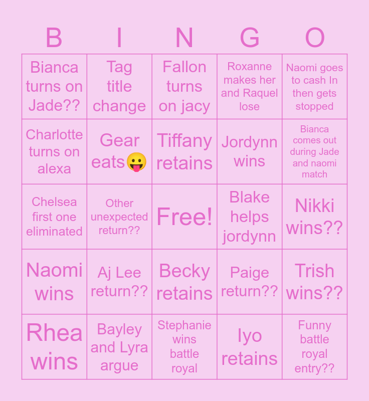 This bingo card has a free space and 24 words: Aj Lee return??, Bayley and Lyra argue, Tiffany retains, Rhea wins, Naomi goes to cash In then gets stopped, Bianca turns on Jade??, Charlotte turns on alexa, Tag title change, Blake helps jordynn, Becky retains, Jordynn wins, Chelsea first one eliminated, Paige return??, Trish wins??, Gear eats😛, Iyo retains, Nikki wins??, Fallon turns on jacy, Bianca comes out during Jade and naomi match, Other unexpected return??, Funny battle royal entry??, Naomi wins, Roxanne makes her and Raquel lose and Stephanie wins battle royal.