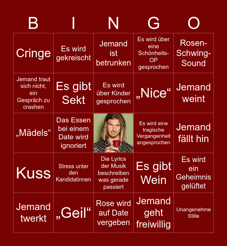 This bingo card has a free space and 31 words: Rose wird auf Date vergeben, Kuss, Das Essen bei einem Date wird ignoriert, Kandidatin wechselt den Bachelor, Cringe, Jemand ist betrunken, Es gibt Sekt, Es gibt Wein, Es wird eine tragische Vergangenheit angesprochen, Jemand geht freiwillig, Jemand fällt hin, Unangenehme Stille, Ein Sprichwort wird verdreht, Es wird gelästert, Jemand weint, Produzent*in ist zu sehen, Es wird ein Geheimnis gelüftet, Stress unter den Kandidatinnen, Kuss, Die Lyrics der Musik beschreiben was gerade passiert, Rosen-Schwing-Sound, Jemand singt, Jemand twerkt, Es wird gekreischt, „Nice“, Jemand traut sich nicht, ein Gespräch zu crashen, Es wird über eine Schönheits-OP gesprochen, „Mädels“, „Geil“, Es wird über Kinder gesprochen and Jemand raucht.