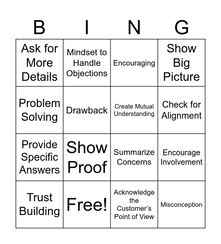 This bingo card has 21 words: Free!, Free!, Mindset to Handle Objections, Earn the Right, Acknowledge the Customer’s Point of View, Create Mutual Understanding, Ask for More Details, Encouraging, Summarize Concerns, Check for Alignment, Provide Specific Answers, Show Big Picture, Misconception, Skepticism, Drawback, Clarify Objections, Trust Building, Show Proof, Problem Solving, Encourage Involvement and Verbal Agreement.