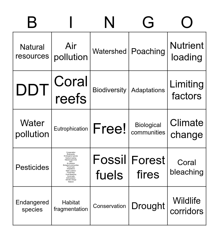 This bingo card has a free space and 25 words: Conservation Biodiversity Endangered species Nutrient loading Natural resources DDT Air pollution Biological communities Fossil fuels Adaptations Water pollution Forest fires Coral bleaching Coral reefs Deforestation Climate change Watersh, Conservation, Biodiversity, Endangered species, Nutrient loading, Natural resources, DDT, Air pollution, Biological communities, Fossil fuels, Adaptations, Water pollution, Forest fires, Coral bleaching, Coral reefs, Deforestation, Climate change, Watershed, Limiting factors, Eutrophication, Wildlife corridors, Habitat fragmentation, Pesticides, Poaching and Drought.