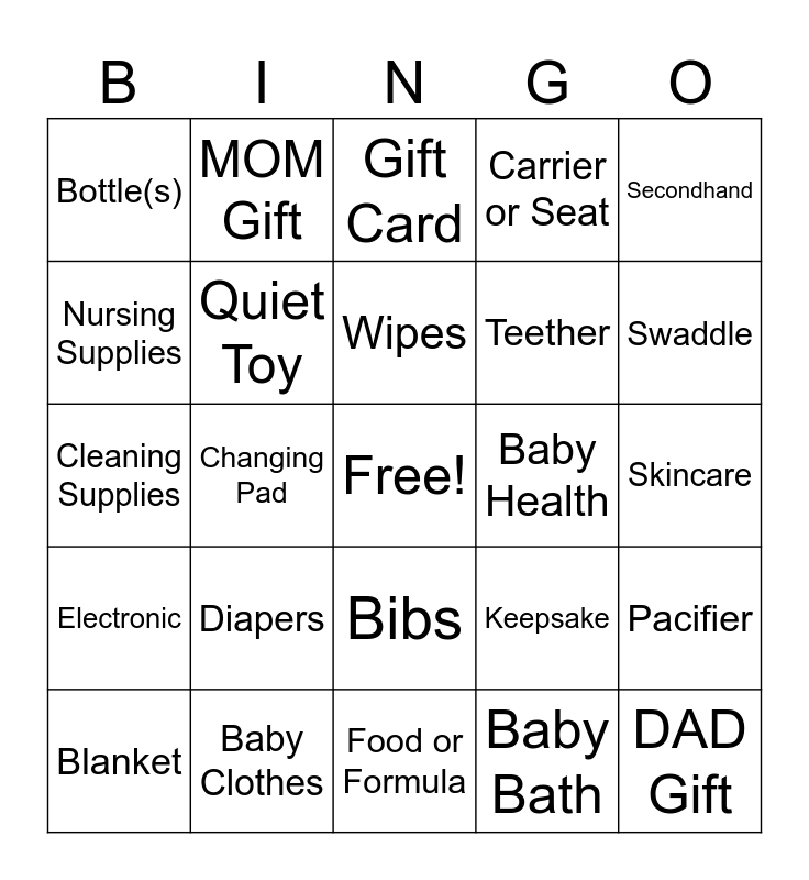 This bingo card has a free space and 24 words: Diapers, Baby Clothes, Wipes, Blanket, Secondhand, Bottle(s), Nursing Supplies, MOM Gift, Baby Health, Bibs, Teether, Cleaning Supplies, Keepsake, Pacifier, Quiet Toy, Baby Bath, Skincare, Gift Card, Swaddle, Changing Pad, DAD Gift, Electronic, Carrier or Seat and Food or Formula.