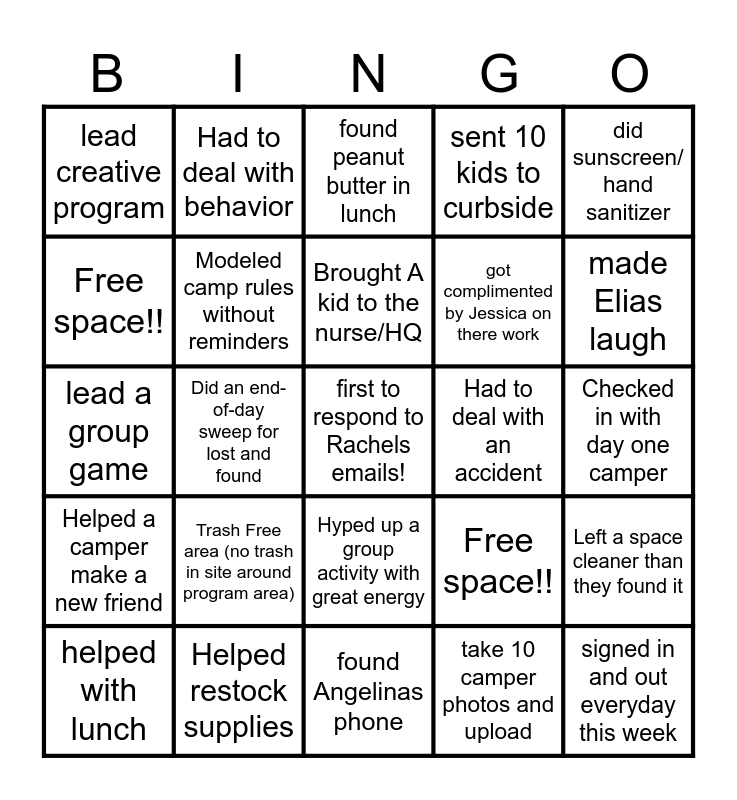This bingo card has 25 words: Trash Free area (no trash in site around program area), found Angelinas phone, Brought A kid to the nurse/HQ, helped with lunch, did sunscreen/ hand sanitizer, lead creative program, Free space!!, Had to deal with behavior, Had to deal with an accident, Hyped up a group activity with great energy, got complimented by Jessica on there work, lead a group game, Free space!!, Left a space cleaner than they found it, Modeled camp rules without reminders, signed in and out everyday this week, Checked in with day one camper, found peanut butter in lunch, made Elias laugh, Did an end-of-day sweep for lost and found, first to respond to Rachels emails!, Helped restock supplies, Helped a camper make a new friend, sent 10 kids to curbside and take 10 camper photos and upload.