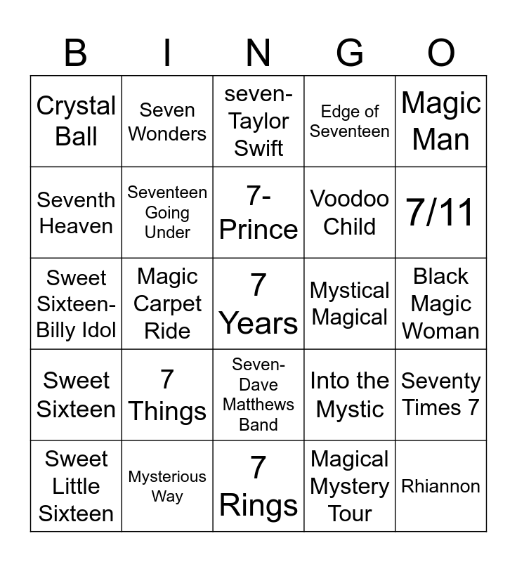 This bingo card has 50 words: Seven Nation Army, 7 Years, 7 Summers, 7 Rings, 7 Things, Seven Bridges Road, Seven Wonders, Seven Spanish Angels (with Ray Charles), Seventh Heaven, Seventeen, Seventeen Going Under, Edge of Seventeen, Seventy Times 7, Into the Mystic, Witchy Woman, Seventh Son of a Seventh Sn, 7- Prince, Mystical Magical, Mystic Brew, Magic Man, Magic Carpet Ride, Magical Mystery Tour, Crystal Ball, Voodoo Child, Santeria, Rhiannon, 7/11, Seven Seas Of Rhye, seven- Taylor Swift, Seven- Dave Matthews Band, Seven Devils, Seven Days in Sunny June, Seven Days- Sting, 7 Days- Craig David, Mysterious Way, Magic, You Can Do Magic, Crystal Ball, Witchcraft, Black Magic Woman, I Put A Spell On You, Under Your Spell, Fortune Teller, You're Sixteen, You're Beautiful (And Your Mine), Sweet Little Sixteen, Sweet Sixteen- Billy Idol, Sweet Sixteen- Hilary Duff, Happy Birthday, Sweet Sixteen, Sweet Sixteen and 16 Candles.