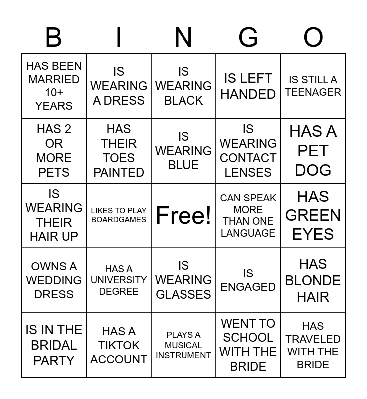 This bingo card has a free space and 44 words: DOESN'T DRINK COFFEE, HAS TRAVELED WITH THE BRIDE, HAS A TATTOO, IS IN THE BRIDAL PARTY, MET SOMEONE FAMOUS, WENT TO SCHOOL WITH THE BRIDE, IS WEARING BLACK, HAS A SISTER, IS STILL A TEENAGER, HAS A TIKTOK ACCOUNT, IS LEFT HANDED, CAN SPEAK MORE THAN ONE LANGUAGE, IS WEARING GLASSES, HAS A UNIVERSITY DEGREE, HAS A PET CAT, PLAYS A MUSICAL INSTRUMENT, HAS LIPSTICK IN THEIR PURSE, IS WEARING THEIR HAIR UP, WAS BORN IN AUGUST, HAS A PET DOG, IS WEARING A DRESS, IS WEARING EARINGS, HAS BLUE EYES, HAS BEEN MARRIED 10+ YEARS, DRINKS COFFEE IN THE MORNING, HAS GREEN EYES, HAS LONG NAILS, IS WEARING FLIPFLOPS, IS ENGAGED, OWNS A WEDDING DRESS, HAS BROWN HAIR, HAS BLONDE HAIR, LOVES TO READ, ENJOYS BAKING, LIKES TO PLAY BOARDGAMES, HAS BEEN ON A CRUISE, CAN CHANGE A TIRE, HAS AN ALLERGY, IS WEARING BLUE, HAS 2 OR MORE PETS, IS WEARING CONTACT LENSES, IS WEARING GLASSES, HAS THEIR TOES PAINTED and IS WEARING A RING.