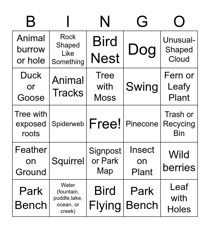 This bingo card has a free space and 24 words: Squirrel, Water (fountain, puddle,lake, ocean, or creek), Tree with Moss, Park Bench, Unusual-Shaped Cloud, Animal burrow or hole, Duck or Goose, Rock Shaped Like Something, Pinecone, Signpost or Park Map, Swing, Tree with exposed roots, Insect on Plant, Wild berries, Animal Tracks, Park Bench, Trash or Recycing Bin, Bird Nest, Fern or Leafy Plant, Spiderweb, Leaf with Holes, Feather on Ground, Dog and Bird Flying.