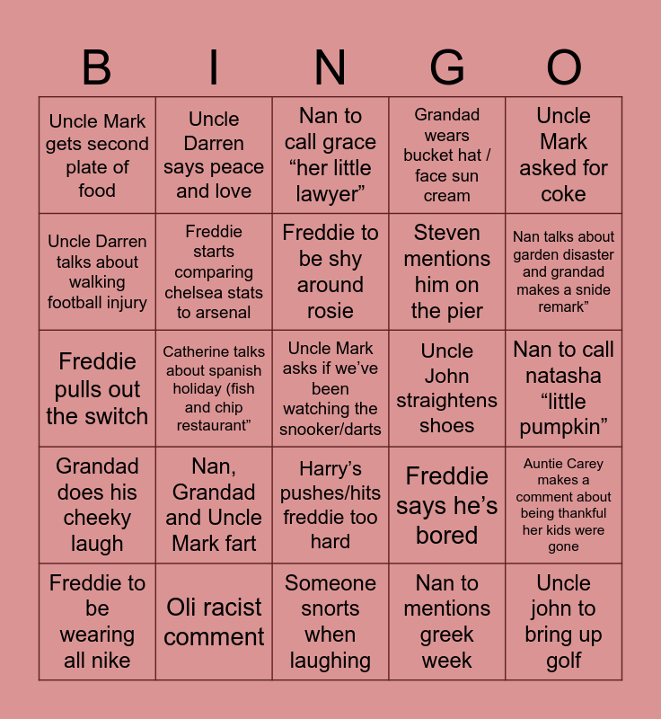 This bingo card has a free space and 24 words: Nan, Grandad and Uncle Mark fart, Oli racist comment, Freddie to be shy around rosie, Freddie to be wearing all nike, Uncle Mark asked for coke, Uncle Mark gets second plate of food, Uncle Darren talks about walking football injury, Uncle Darren says peace and love, Uncle John straightens shoes, Harry’s pushes/hits freddie too hard, Steven mentions him on the pier, Freddie pulls out the switch, Freddie says he’s bored, Auntie Carey makes a comment about being thankful her kids were gone, Freddie starts comparing chelsea stats to arsenal, Nan to mentions greek week, Nan to call natasha “little pumpkin”, Nan to call grace “her little lawyer”, Nan talks about garden disaster and grandad makes a snide remark”, Catherine talks about spanish holiday (fish and chip restaurant”, Uncle john to bring up golf, Grandad does his cheeky laugh, Grandad wears bucket hat / face sun cream and Someone snorts when laughing.