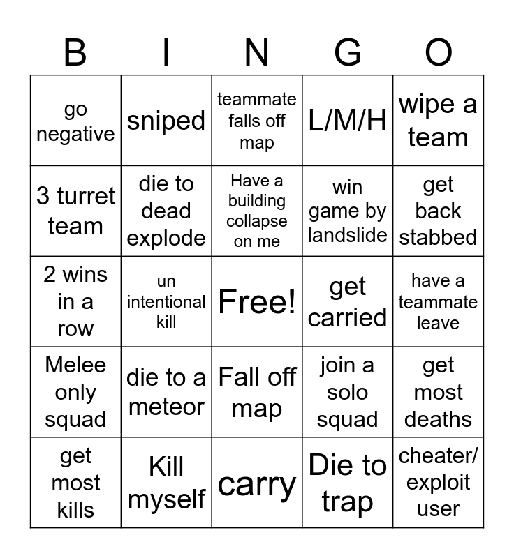 This bingo card has a free space and 26 words: Fall off map, Die to trap, Have a building collapse on me, Kill myself, wipe a team, go negative, 3 turret team, sniped, have a teammate leave, join a solo squad, win game by landslide, 2 wins in a row, get most deaths, get most kills, un intentional kill, 3 lights, L/M/H, Melee only squad, teammate falls off map, cheater/ exploit user, get back stabbed, carry, get carried, die to a meteor, die to dead explode and stylish kill.