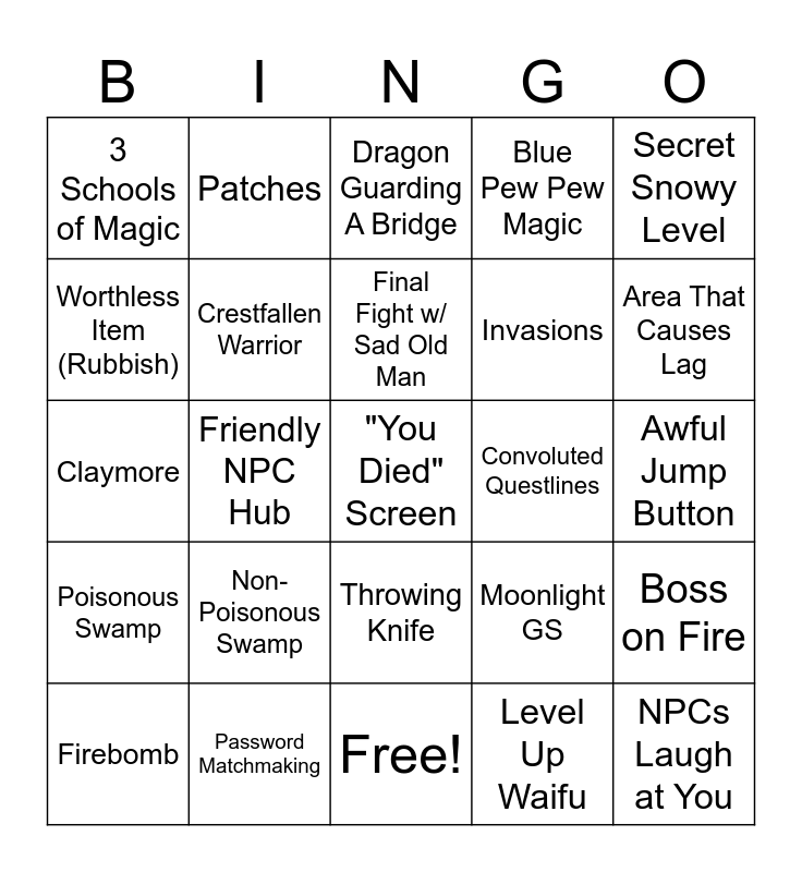 This bingo card has 25 words: Poisonous Swamp, Password Matchmaking, "You Died" Screen, Level Up Waifu, Secret Snowy Level, 3 Schools of Magic, Patches, Dragon Guarding A Bridge, Convoluted Questlines, Boss on Fire, Worthless Item (Rubbish), Crestfallen Warrior, Free!, Moonlight GS, Area That Causes Lag, Firebomb, Friendly NPC Hub, Final Fight w/ Sad Old Man, Invasions, Awful Jump Button, Claymore, Non-Poisonous Swamp, Throwing Knife, Blue Pew Pew Magic and NPCs Laugh at You.