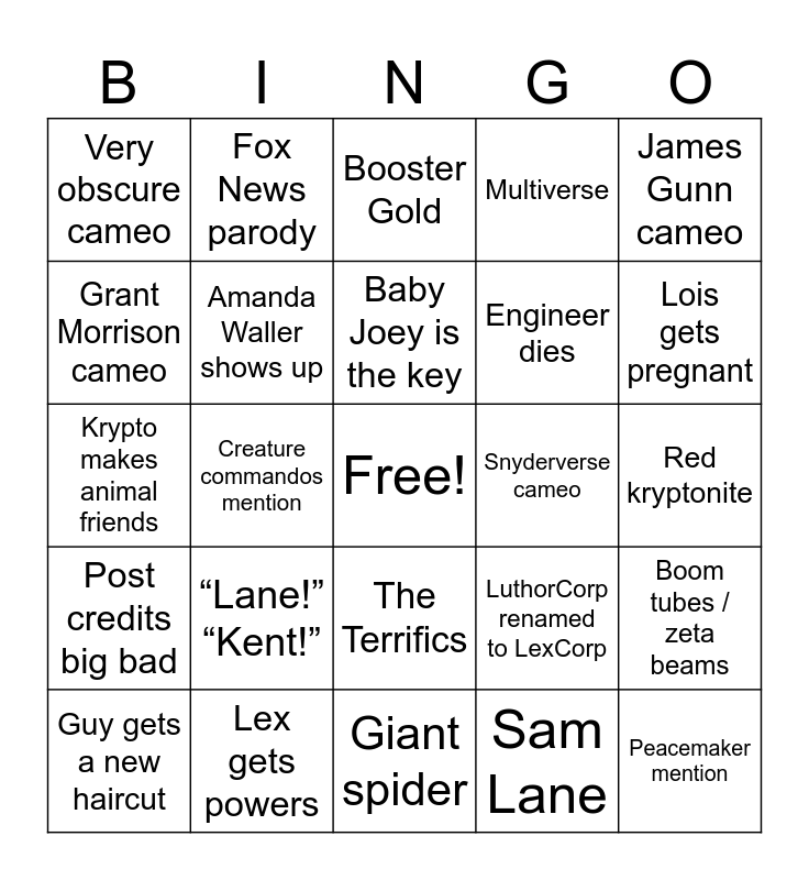 This bingo card has a free space and 24 words: “Lane!” “Kent!”, Lex gets powers, Baby Joey is the key, Guy gets a new haircut, James Gunn cameo, Very obscure cameo, Grant Morrison cameo, Fox News parody, Snyderverse cameo, The Terrifics, Engineer dies, Krypto makes animal friends, LuthorCorp renamed to LexCorp, Boom tubes / zeta beams, Amanda Waller shows up, Sam Lane, Red kryptonite, Booster Gold, Lois gets pregnant, Creature commandos mention, Peacemaker mention, Post credits big bad, Multiverse and Giant spider.
