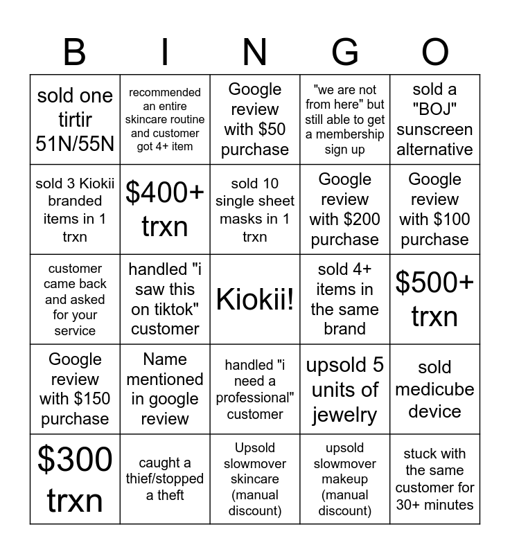This bingo card has a free space and 24 words: $300 trxn, Name mentioned in google review, sold 10 single sheet masks in 1 trxn, upsold slowmover makeup (manual discount), sold a "BOJ" sunscreen alternative, sold one tirtir 51N/55N, recommended an entire skincare routine and customer got 4+ item, Google review with $50 purchase, sold 4+ items in the same brand, $500+ trxn, customer came back and asked for your service, $400+ trxn, upsold 5 units of jewelry, sold medicube device, sold 3 Kiokii branded items in 1 trxn, caught a thief/stopped a theft, Upsold slowmover skincare (manual discount), "we are not from here" but still able to get a membership sign up, Google review with $100 purchase, Google review with $150 purchase, handled "i saw this on tiktok" customer, handled "i need a professional" customer, Google review with $200 purchase and stuck with the same customer for 30+ minutes.