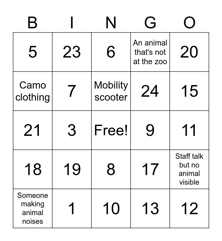 This bingo card has a free space and 30 words: 1, 2, 3, 4, 5, 6, 7, 8, 9, 10, 11, 12, 13, 14, 15, 16, 17, 18, 19, 20, 21, 22, 23, 24, Camo clothing, An animal that's not at the zoo, Staff talk but no animal visible, Someone making animal noises, Mobility scooter and Spilled food/drink.