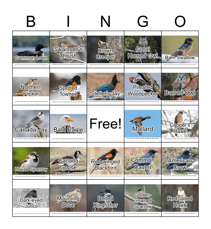 This bingo card has 39 images, a free space and 39 words: Chestnut-backed Chickadee ........................., American Robin ........................., Song Sparrow ......................., Spotted Towhee ......................., Dark-eyed Junco ........................, Red-winged Blackbird ......................, Steller's Jay ......................, House Finch ....................., Barn Swallow ........................, House Sparrow ........................., Bald Eagle ..................., Great Horned Owl ....................., Red-tailed Hawk ......................, Cooper's Hawk ......................., Mallard .................., Canada Goose ....................., Killdeer .................., Common Loon ........................, Anna's Hummingbird ......................, Common Raven ...................., Northern Flicker ......................, Belted Kingfisher ......................, Pileated Woodpecker ......................, Barred Owl ..................., Wood Duck ..................., Pied-billed Grebe ..................., White-crowned Sparrow ......................., Pacific Wren ...................., Varied Thrush ......................, Swainson's Thrush ....................., Yellow Warbler ......................., Ruby-crowned Kinglet ......................., Brown Creeper ......................., Mourning Dove ......................, Golden-crowned Sparrow ........................., Fox Sparrow ....................., American Crow ....................., Canada Jay ................... and Barn Owl ..................