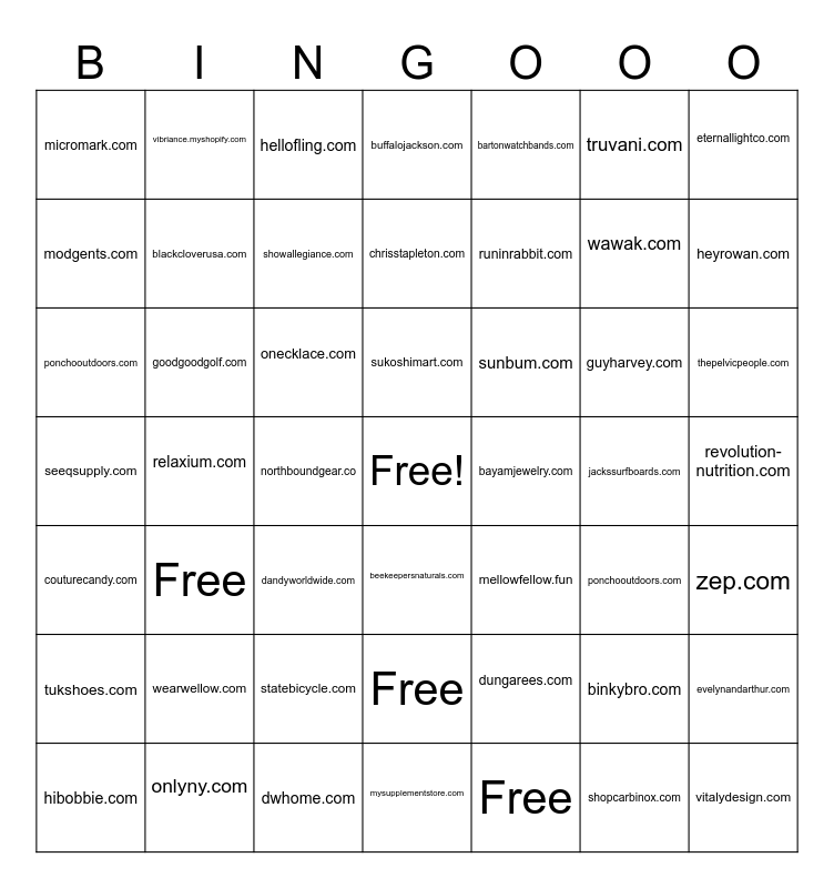 This bingo card has a free space and 48 words: dungarees.com, wawak.com, mysupplementstore.com, relaxium.com, onecklace.com, revolution-nutrition.com, vibriance.myshopify.com, onlyny.com, truvani.com, beekeepersnaturals.com, eternallightco.com, buffalojackson.com, guyharvey.com, sunbum.com, tukshoes.com, jackssurfboards.com, modgents.com, heyrowan.com, binkybro.com, bartonwatchbands.com, runinrabbit.com, northboundgear.co, micromark.com, blackcloverusa.com, evelynandarthur.com, showallegiance.com, thepelvicpeople.com, hibobbie.com, sukoshimart.com, goodgoodgolf.com, shopcarbinox.com, bayamjewelry.com, zep.com, wearwellow.com, seeqsupply.com, mellowfellow.fun, ponchooutdoors.com, ponchooutdoors.com, dandyworldwide.com, statebicycle.com, couturecandy.com, vitalydesign.com, hellofling.com, dwhome.com, chrisstapleton.com, Free, Free and Free.