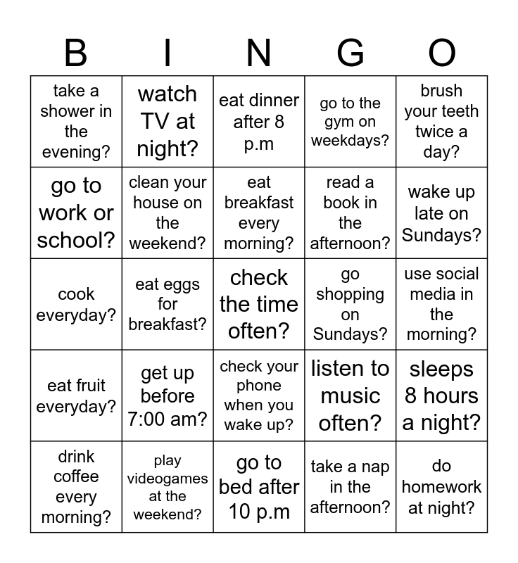 This bingo card has 25 words: get up before 7:00 am?, go to bed after 10 p.m, eat breakfast every morning?, drink coffee every morning?, brush your teeth twice a day?, take a shower in the evening?, go to work or school?, watch TV at night?, go shopping on Sundays?, check your phone when you wake up?, read a book in the afternoon?, cook everyday?, listen to music often?, sleeps 8 hours a night?, clean your house on the weekend?, do homework at night?, use social media in the morning?, eat dinner after 8 p.m, wake up late on Sundays?, eat eggs for breakfast?, check the time often?, play videogames at the weekend?, eat fruit everyday?, go to the gym on weekdays? and take a nap in the afternoon?.
