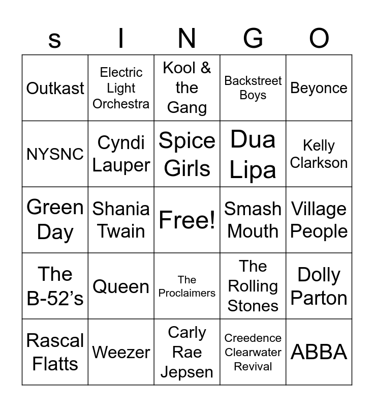 This bingo card has a free space and 37 words: Justin TImberlake, Journey, AC/DC, Cyndi Lauper, Dolly Parton, Queen, Spice Girls, Lady Gaga, Beyonce, Taylor Swift, Shania Twain, Backstreet Boys, ABBA, Village People, NYSNC, The B-52’s, Cher, Kool & the Gang, The Proclaimers, Smash Mouth, Outkast, Kelly Clarkson, Rascal Flatts, Carly Rae Jepsen, Pink, Creedence Clearwater Revival, Electric Light Orchestra, Aerosmith, Muse, Earth, Wind & Fire, Bon Jovi, Weezer, Green Day, Luke Bryan, The Rolling Stones, Dua Lipa and Sugar Ray.