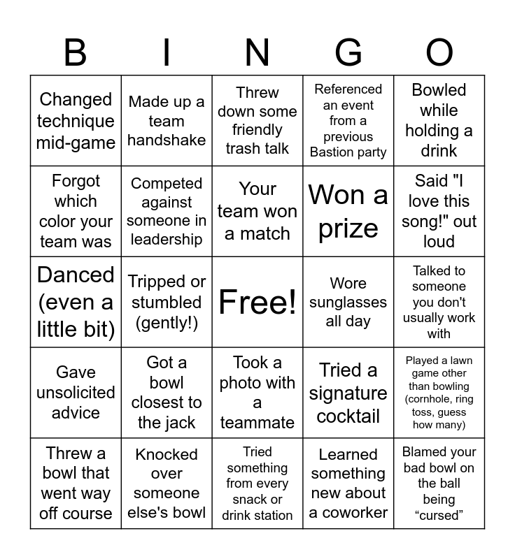 This bingo card has a free space and 24 words: Got a bowl closest to the jack, Knocked over someone else's bowl, Your team won a match, Threw a bowl that went way off course, Bowled while holding a drink, Changed technique mid-game, Forgot which color your team was, Made up a team handshake, Wore sunglasses all day, Took a photo with a teammate, Won a prize, Danced (even a little bit), Tried a signature cocktail, Played a lawn game other than bowling (cornhole, ring toss, guess how many), Competed against someone in leadership, Learned something new about a coworker, Talked to someone you don't usually work with, Threw down some friendly trash talk, Said "I love this song!" out loud, Tripped or stumbled (gently!), Blamed your bad bowl on the ball being “cursed”, Gave unsolicited advice, Referenced an event from a previous Bastion party and Tried something from every snack or drink station.