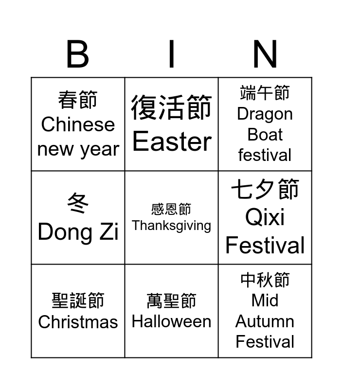 This bingo card has 9 words: 聖誕節 Christmas, 端午節 Dragon Boat festival, 復活節 Easter, 冬 Dong Zi, 春節 Chinese new year, 七夕節 Qixi Festival, 感恩節 Thanksgiving, 中秋節 Mid Autumn Festival and 萬聖節 Halloween.