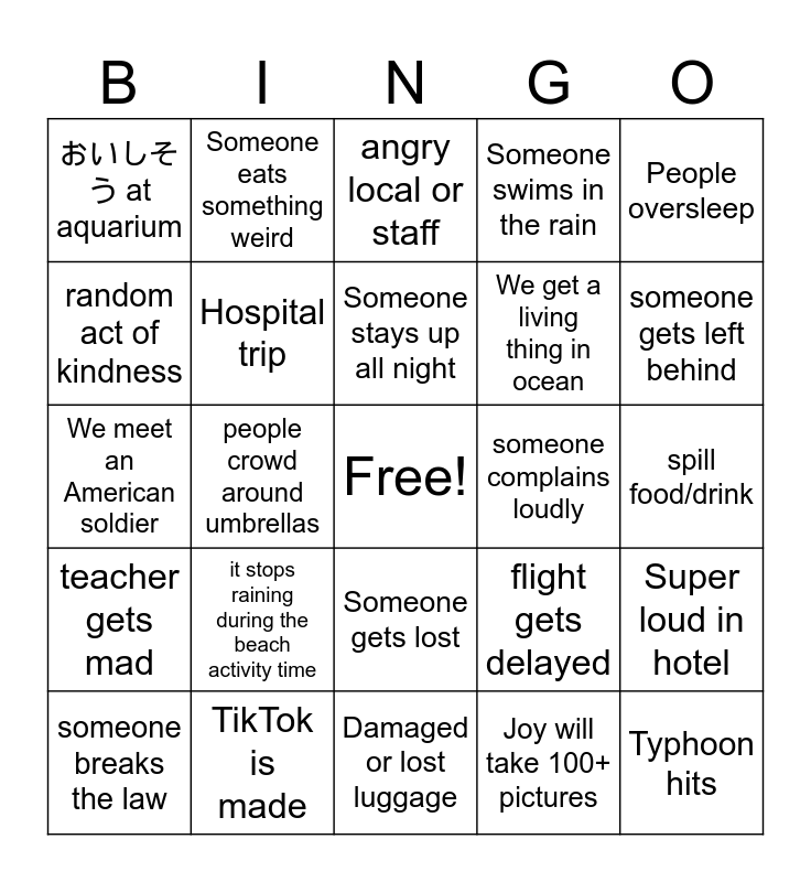 This bingo card has a free space and 24 words: it stops raining during the beach activity time, TikTok is made, Someone stays up all night, someone breaks the law, People oversleep, おいしそう at aquarium, random act of kindness, Someone eats something weird, someone complains loudly, Someone gets lost, We get a living thing in ocean, We meet an American soldier, flight gets delayed, Super loud in hotel, Hospital trip, Joy will take 100+ pictures, spill food/drink, angry local or staff, someone gets left behind, people crowd around umbrellas, Typhoon hits, teacher gets mad, Someone swims in the rain and Damaged or lost luggage.
