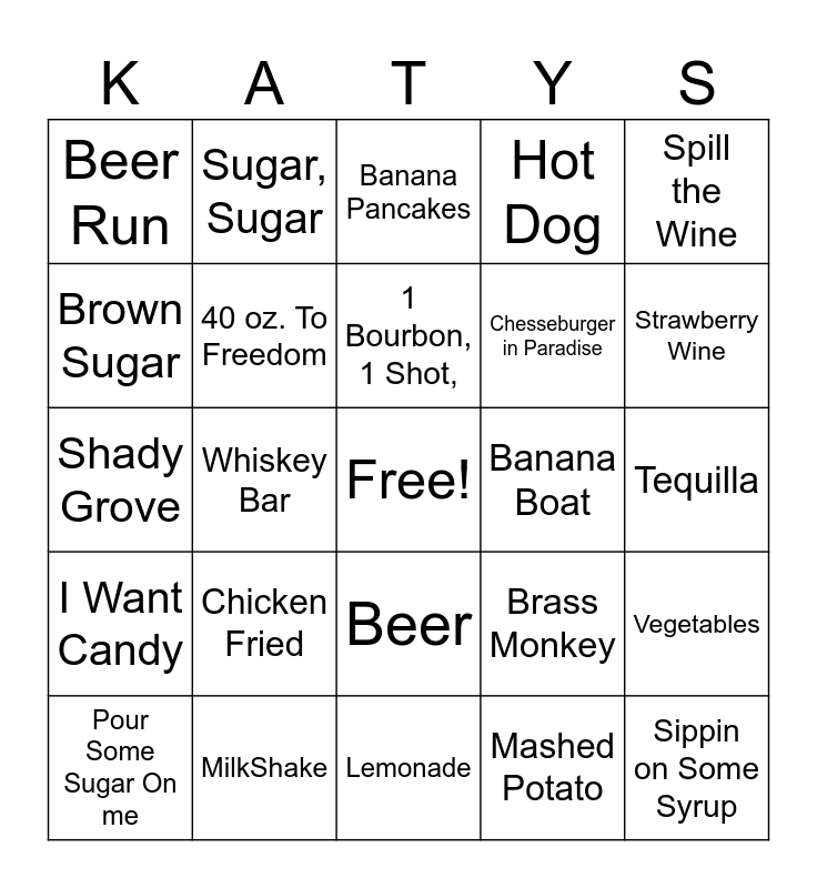 This bingo card has a free space and 28 words: Vegetables, Crawfish, Chesseburger in Paradise, Mashed Potato, Brown Sugar, Banana Pancakes, Sugar, Sugar, I Want Candy, Banana Boat, Pour Some Sugar On me, Shady Grove, Hot Dog, MilkShake, Lemonade, Strawberry Wine, Mama Told Me, Chicken Fried, 40 oz. To Freedom, 1 Bourbon, 1 Shot,, Beer, Beer Run, Typsy, Sippin on Some Syrup, Whiskey Bar, Tequilla, Brass Monkey, Spill the Wine and Blame it.