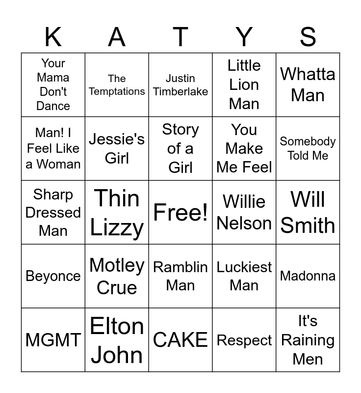 This bingo card has a free space and 37 words: Good Charlotte, Queen, The Girl is Mine, Jessie's Girl, Madonna, Motley Crue, Story of a Girl, She's So HIGH, Whatta Man, Lola, Thin Lizzy, Little Lion Man, It's Raining Men, Will Smith, Man! I Feel Like a Woman, Beyonce, I'm Too Sexy, Justin Timberlake, Ramblin Man, Willie Nelson, Your Mama Don't Dance, Somebody Told Me, MGMT, CAKE, Who Let the Dogs Out, Respect, The Temptations, Aerosmith, Bad Girls, Just a Girl, Son of A Preacher Man, Elton John, Sharp Dressed Man, Boys, Luckiest Man, You Make Me Feel and Jet.