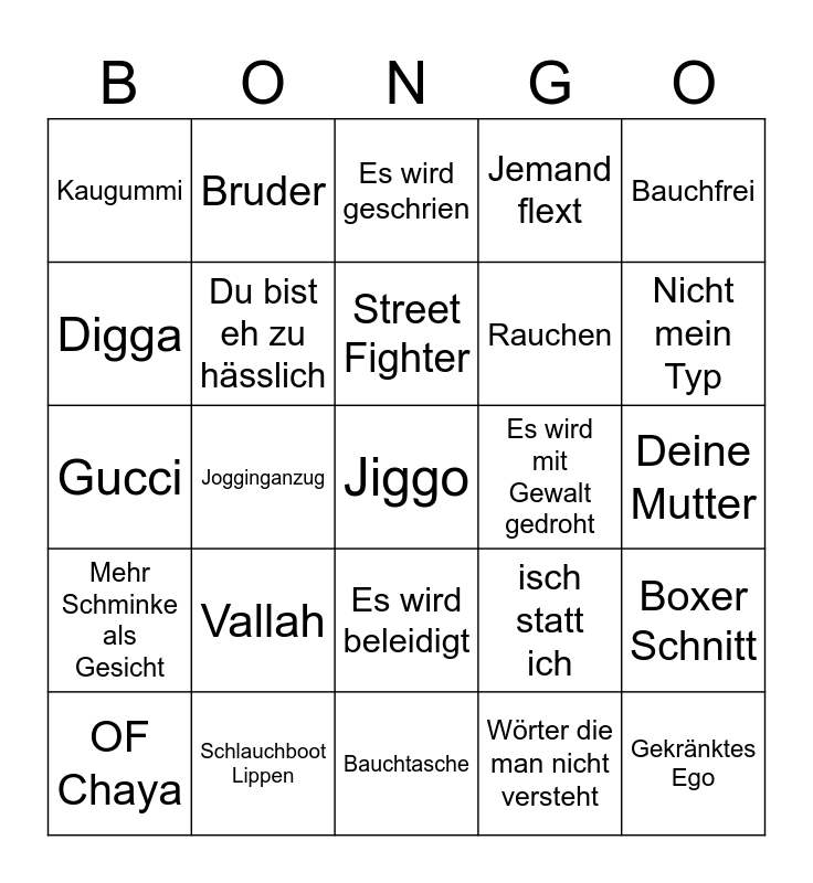 This bingo card has a free space and 24 words: Vallah, Schlauchboot Lippen, Street Fighter, OF Chaya, Bauchfrei, Kaugummi, Digga, Bruder, Es wird mit Gewalt gedroht, Es wird beleidigt, Rauchen, Gucci, isch statt ich, Boxer Schnitt, Du bist eh zu hässlich, Wörter die man nicht versteht, Deine Mutter, Es wird geschrien, Nicht mein Typ, Jogginganzug, Gekränktes Ego, Mehr Schminke als Gesicht, Jemand flext and Bauchtasche.