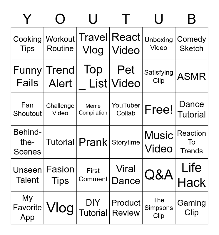 This bingo card has 36 words: Viral Dance, First Comment, Product Review, Funny Fails, Behind-the-Scenes, YouTuber Collab, Trend Alert, DIY Tutorial, Unboxing Video, Q&A, ASMR, React Video, Life Hack, Challenge Video, Pet Video, Cooking Tips, Unseen Talent, Free!, Fan Shoutout, Travel Vlog, Meme Compilation, Tutorial, Storytime, Prank, Music Video, Workout Routine, Satisfying Clip, Vlog, Top _ List, Comedy Sketch, Gaming Clip, My Favorite App, Reaction To Trends, Dance Tutorial, Fasion Tips and The Simpsons Clip.