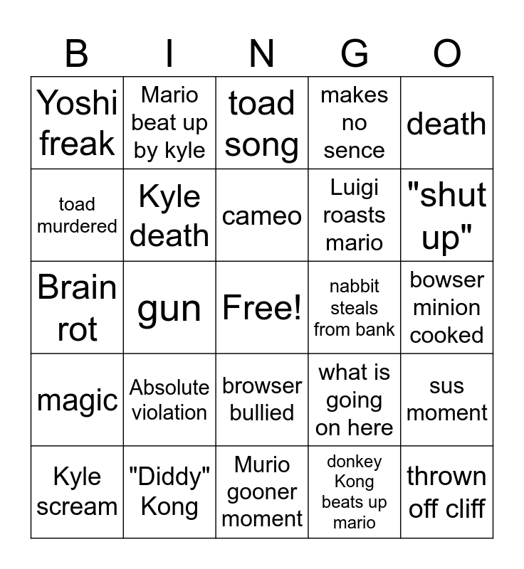 This bingo card has a free space and 24 words: Absolute violation, "Diddy" Kong, cameo, Kyle scream, death, Yoshi freak, toad murdered, Mario beat up by kyle, nabbit steals from bank, browser bullied, Luigi roasts mario, Brain rot, what is going on here, sus moment, Kyle death, donkey Kong beats up mario, bowser minion cooked, toad song, "shut up", gun, thrown off cliff, magic, makes no sence and Murio gooner moment.