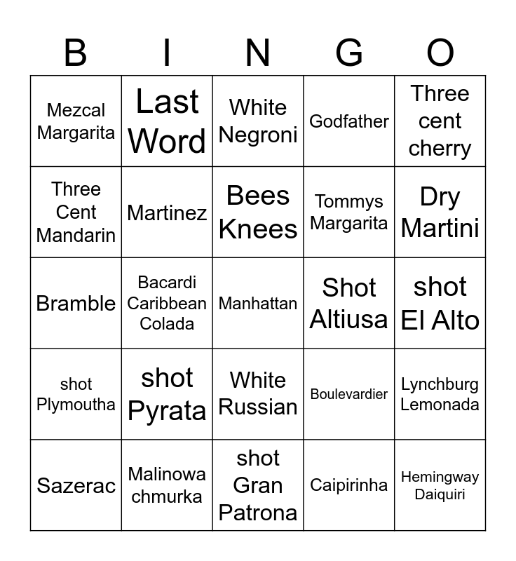 This bingo card has 25 words: shot Plymoutha, Malinowa chmurka, Manhattan, Caipirinha, Three cent cherry, Mezcal Margarita, Last Word, White Negroni, Shot Altiusa, Lynchburg Lemonada, Three Cent Mandarin, Martinez, shot Gran Patrona, Boulevardier, Dry Martini, Sazerac, Bacardi Caribbean Colada, Bees Knees, Tommys Margarita, shot El Alto, Bramble, shot Pyrata, White Russian, Godfather and Hemingway Daiquiri.