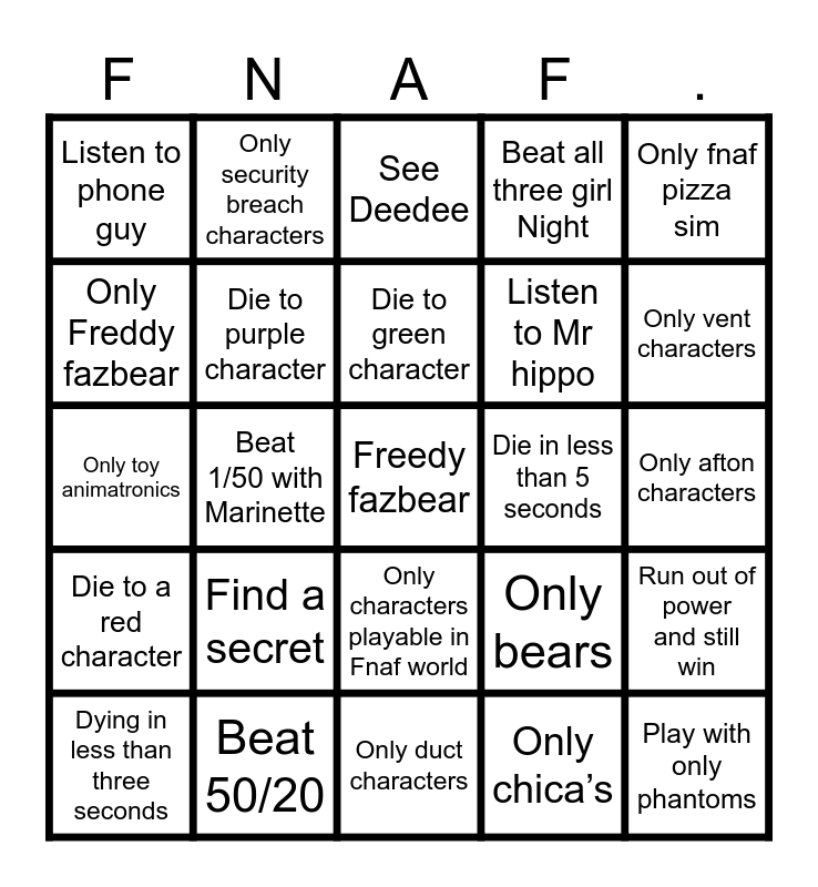 This bingo card has a free space and 29 words: Beat every challenge, Beat 50/20, See Deedee, Die…, Only fnaf pizza sim, Listen to phone guy, Die to purple character, Die to green character, Die in less than 5 seconds, Run out of power and still win, Dying in less than three seconds, Beat 1/50 with Marinette, Only chica’s, Play with only phantoms, Only toy animatronics, Fredbear secret, Only duct characters, Only bears, Only vent characters, Die to a red character, Find a secret, Old man consequences secret, Listen to Mr hippo, Only afton characters, Only Freddy fazbear, Only security breach characters, Only characters playable in Fnaf world, Beat all three girl Night and Get the happy frog secret.