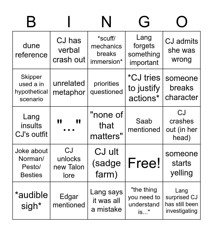 This bingo card has 25 words: CJ unlocks new Talon lore, Lang says it was all a mistake, priorities questioned, *audible sigh*, CJ admits she was wrong, dune reference, Skipper used a in hypothetical scenario, CJ has verbal crash out, Saab mentioned, CJ ult (sadge farm), *CJ tries to justify actions*, Lang insults CJ's outfit, Free!, someone starts yelling, unrelated metaphor, Lang surprised CJ has still been investigating, CJ crashes out (in her head), *scuff/ mechanics breaks immersion*, someone breaks character, "...", "none of that matters", Edgar mentioned, Joke about Norman/ Pesto/ Besties, Lang forgets something important and "the thing you need to understand is...".