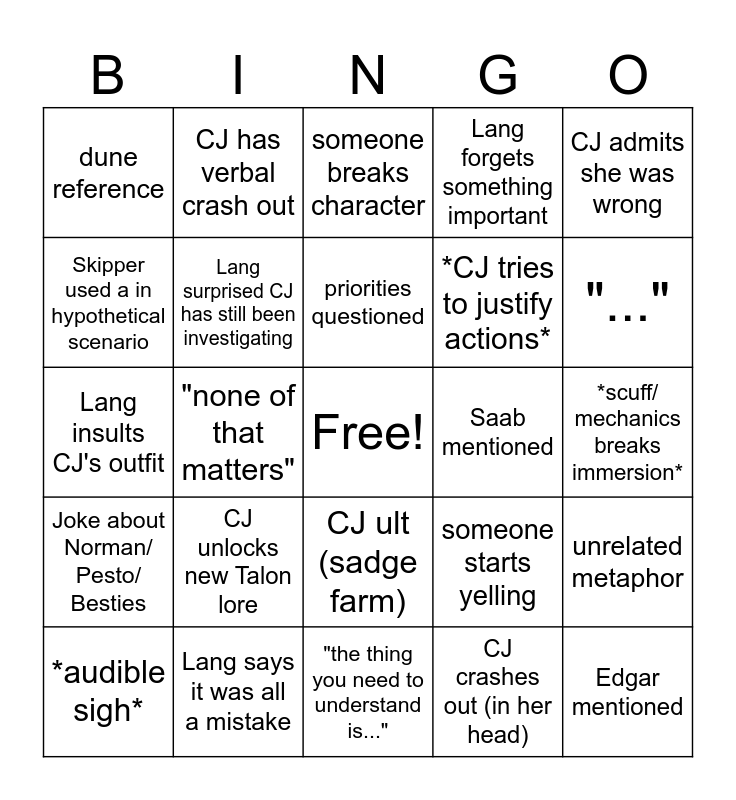 This bingo card has a free space and 24 words: CJ unlocks new Talon lore, Lang says it was all a mistake, priorities questioned, *audible sigh*, CJ admits she was wrong, dune reference, Skipper used a in hypothetical scenario, CJ has verbal crash out, Saab mentioned, CJ ult (sadge farm), *CJ tries to justify actions*, Lang insults CJ's outfit, someone starts yelling, unrelated metaphor, Lang surprised CJ has still been investigating, CJ crashes out (in her head), *scuff/ mechanics breaks immersion*, someone breaks character, "...", "none of that matters", Edgar mentioned, Joke about Norman/ Pesto/ Besties, Lang forgets something important and "the thing you need to understand is...".