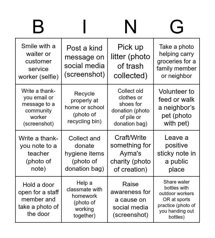 This bingo card has 16 words: Help a classmate with homework (photo of working together), Leave a positive sticky note in a public place, Pick up litter (photo of trash collected), Smile with a waiter or customer service worker (selfie), Write a thank-you note to a teacher (photo of note), Post a kind message on social media (screenshot), Craft/Write something for Ayma's charity (photo of creation), Raise awareness for a cause on social media (screenshot), Write a thank-you email or message to a community worker (screenshot), Recycle properly at home or school (photo of recycling bin), Hold a door open for a staff member and take a photo of the door, Take a photo helping carry groceries for a family member or neighbor, Collect and donate hygiene items (photo of donation bag), Volunteer to feed or walk a neighbor’s pet (photo with pet), Collect old clothes or shoes for donation (photo of pile or donation bag) and Share water bottles with outdoor workers OR at sports practice (photo of you handing out bottles).
