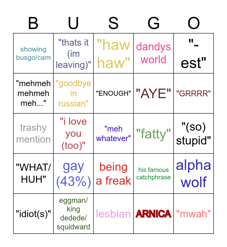 This bingo card has a free space and 24 words: gay (43%), eggman/ king dedede/ squidward, "ENOUGH", "idiot(s)", "-est", showing busgo/cam, "mehmeh mehmeh meh...", "thats it (im leaving)", "fatty", being a freak, "AYE", trashy mention, his famous catchphrase, alpha wolf, "goodbye in russian", ARNICA, "(so) stupid", "haw haw", "GRRRR", "i love you (too)", "mwah", "WHAT/ HUH", dandys world and lesbian.