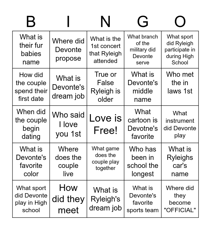 This bingo card has a free space and 24 words: Where does the couple live, How did they meet, True or False Ryleigh is older, What sport did Devonte play in High school, What sport did Ryleigh participate in during High School, What is their fur babies name, How did the couple spend their first date, Where did Devonte propose, What cartoon is Devotne's favorite, What game does the couple play together, What is Devonte's middle name, When did the couple begin dating, Who has been in school the longest, What is Ryleighs car's name, What is Devonte's dream job, What is Devonte's favorite sports team, What instrument did Devonte play, What is the 1st concert that Ryleigh attended, Who met the in laws 1st, Who said I love you 1st, Where did they become "OFFICIAL", What is Devonte's favorite color, What branch of the military did Devonte serve and What is Ryleigh's dream job.