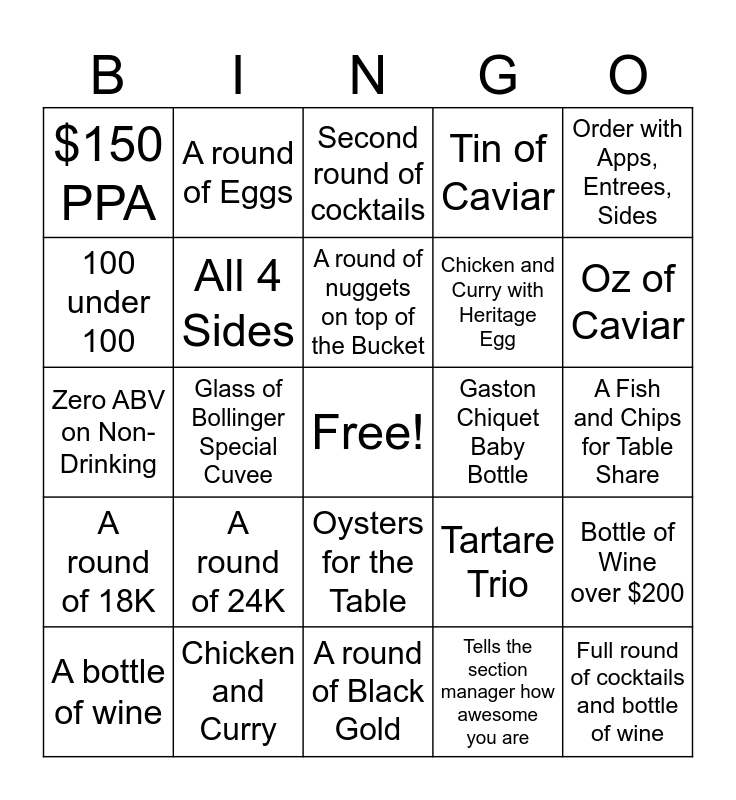 This bingo card has a free space and 24 words: A round of 24K, Chicken and Curry, A round of nuggets on top of the Bucket, A bottle of wine, Order with Apps, Entrees, Sides, $150 PPA, 100 under 100, A round of Eggs, Gaston Chiquet Baby Bottle, Oysters for the Table, Chicken and Curry with Heritage Egg, Zero ABV on Non-Drinking, Tartare Trio, Bottle of Wine over $200, All 4 Sides, Tells the section manager how awesome you are, A Fish and Chips for Table Share, Second round of cocktails, Oz of Caviar, Glass of Bollinger Special Cuvee, Full round of cocktails and bottle of wine, A round of 18K, Tin of Caviar and A round of Black Gold.