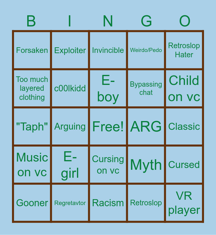 This bingo card has a free space and 24 words: Gooner, E-girl, E-boy, Retroslop, Retroslop Hater, Forsaken, Exploiter, Invincible, ARG, Classic, "Taph", c00lkidd, Myth, Cursed, Too much layered clothing, Regretavtor, Racism, Weirdo/Pedo, Child on vc, Music on vc, Arguing, Cursing on vc, Bypassing chat and VR player.
