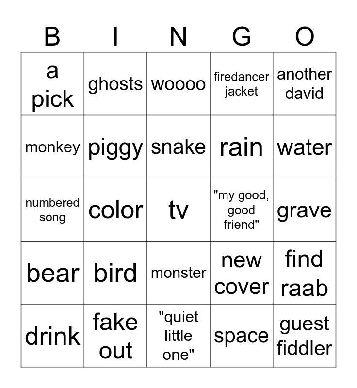 This bingo card has a free space and 24 words: bird, fake out, snake, drink, another david, a pick, monkey, ghosts, "my good, good friend", monster, rain, numbered song, new cover, find raab, piggy, space, grave, woooo, water, color, guest fiddler, bear, firedancer jacket and "quiet little one".