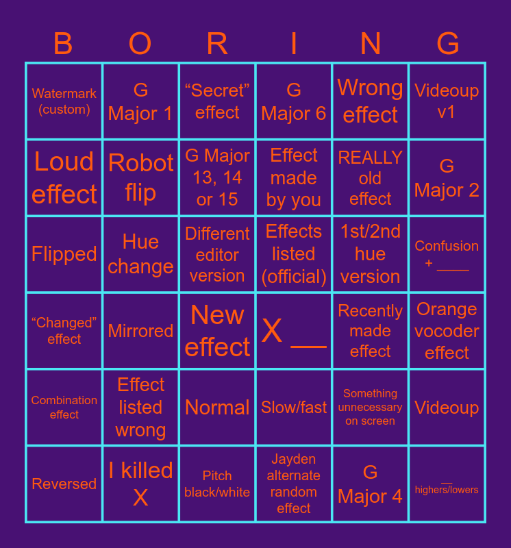 This bingo card has 72 words: G Major, G Major 1, G Major 2, G Major 4, G Major 5, G Major 7, G Major 6, G Major 3, G Major 13, 14 or 15, Alternate version, New effect, Effect you don’t recognise, Effect made by you, Watermark (custom), Watermark (editor), REALLY old effect, “Changed” effect, Wrong effect, Contains effects (free), Different editor version, 1st/2nd hue version, Flipped, Mirrored, Slow/fast, Reversed, Confusion, Luig group, Mari group, I killed X, __ X, X __, Rare effect, IL vocodex effect, Vocoded effect, Orange vocoder effect, Jayden alternate random effect, 4ormulator v1, 4ormulator, Videoup v1, Videoup, Confusion + ____, Combination effect, Opposite of a previous effect, Super short name, Super long name, Effects listed (official), Something unnecessary on screen, Gradient map, Light luma key, Pitch black/white, __ highers/lowers, Effect with a color in the name, Inverted, Hue change, Effect listed wrong, Effect not listed, “Secret” effect, Robot flip, How X turns into style effect, Super duper low/high pitched, Over 30 effects, Under 31 effects, Normal, Recently made effect, Custom thumbnail, Other letter major, Loud effect, Emotion effect, G Major 74, Wave, A LOT of pitches and Very simple effect.