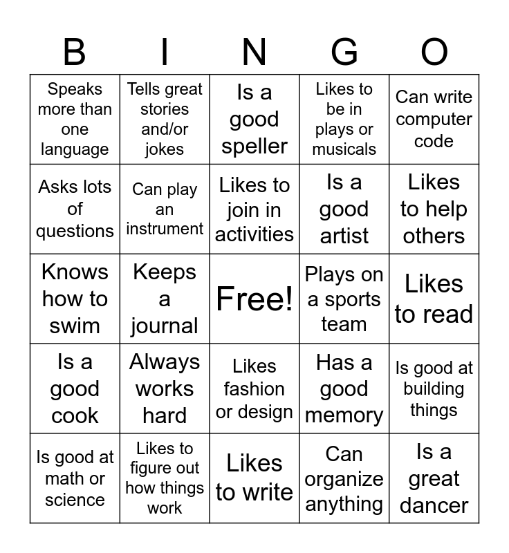 This bingo card has a free space and 24 words: Is good at math or science, Always works hard, Likes to join in activities, Can organize anything, Can write computer code, Speaks more than one language, Tells great stories and/or jokes, Is a good speller, Plays on a sports team, Likes to read, Knows how to swim, Can play an instrument, Has a good memory, Is good at building things, Asks lots of questions, Likes to figure out how things work, Likes to write, Likes to be in plays or musicals, Likes to help others, Is a good cook, Keeps a journal, Likes fashion or design, Is a good artist and Is a great dancer.