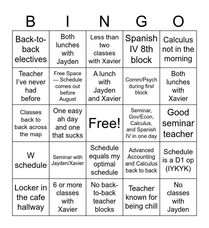 This bingo card has a free space and 25 words: Seminar with Jayden/Xavier, No back-to-back teacher blocks, A lunch with Jayden and Xavier, Locker in the cafe hallway, Calculus not in the morning, Back-to-back electives, Teacher I’ve never had before, Both lunches with Jayden, Seminar, Gov/Econ, Calculus, and Spanish IV in one day, Schedule equals my optimal schedule, Comm/Psych during first block, Classes back to back across the map, Advanced Accounting and Calculus back to back, Schedule is a D1 op (IYKYK), Free Space — Schedule comes out before August, English and Comm/Psych on different days, Good seminar teacher, Less than two classes with Xavier, Both lunches with Xavier, One easy ah day and one that sucks, No classes with Jayden, 6 or more classes with Xavier, W schedule, Spanish IV 8th block and Teacher known for being chill.